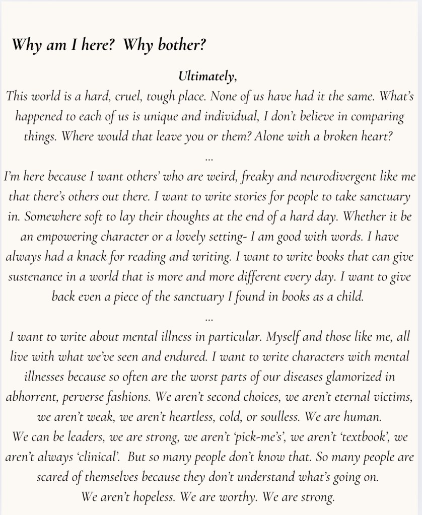 I would like to write with a purpose. If anything, I want to write stories that give someone a safe place to let their mind wander to. I write as someone who lives with chronic mental illness, and I would like to possibly inspire hope in others, or anyone who is suffering. I also want to make my pages and spots on the internet a “safe” cozy place. I want to create a little soft sanctuary on my pages for others who just want to relax, or have good vibes.